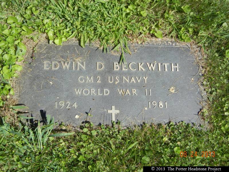 | Beckwith | Edwin D | 1924 | 1981 | Emily E. Beckwith | WWII GM2 US Navy See Also Military Plate See Also Close-Up |