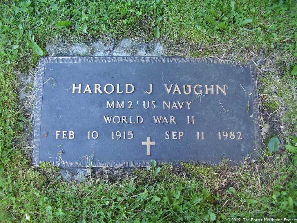 | Vaughn | Harold J. | February 10, 1915 | September 11, 1982 | Vaughn, Mary B. | MM2 US Navy WWII See Also Military Plate |